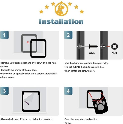 The pet screen door allows you to install your pet screen door into a screen door, window, and any other screen area. It is suitable for all pets up to small/medium size dogs.